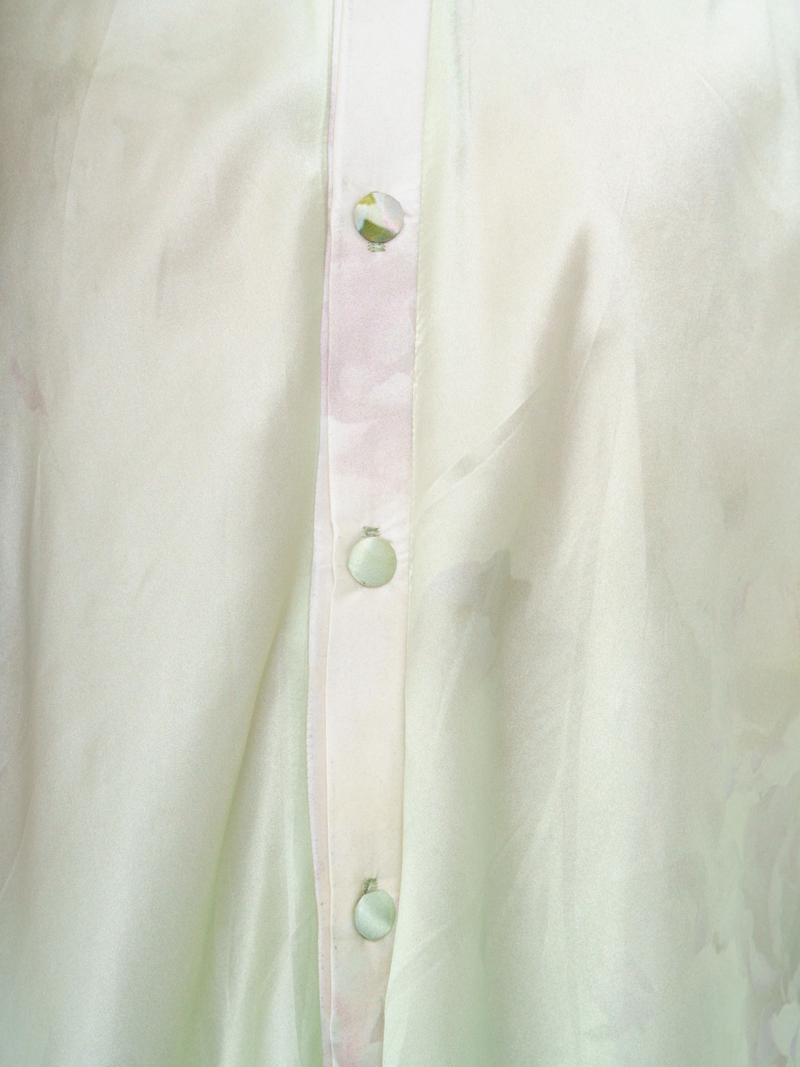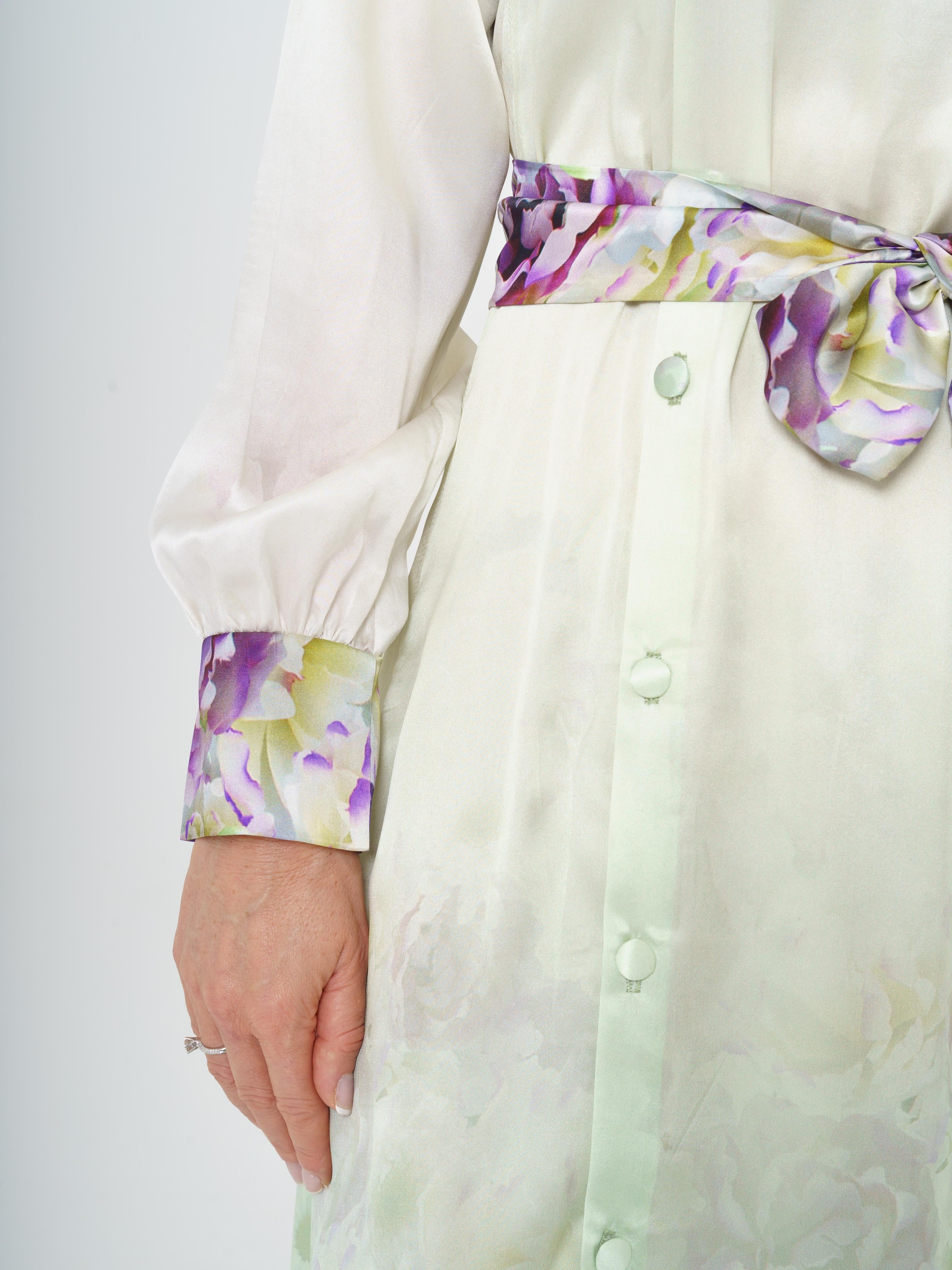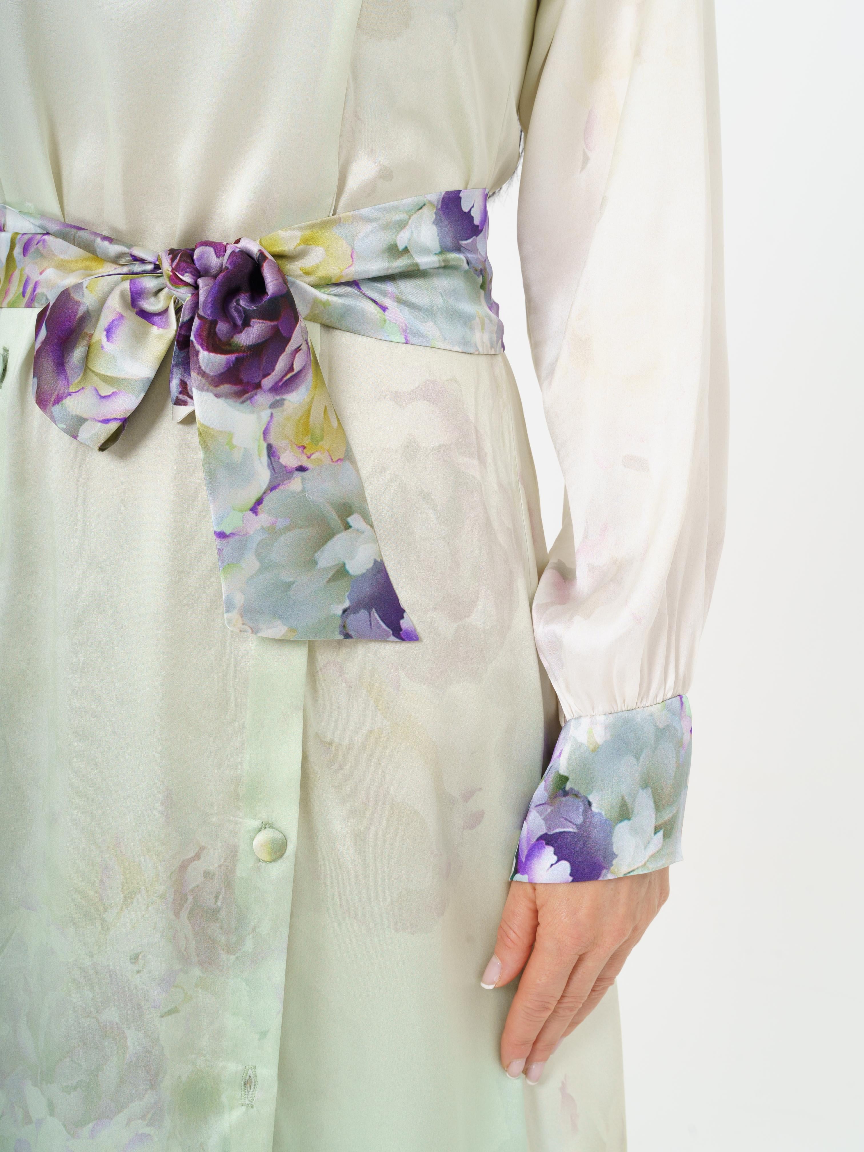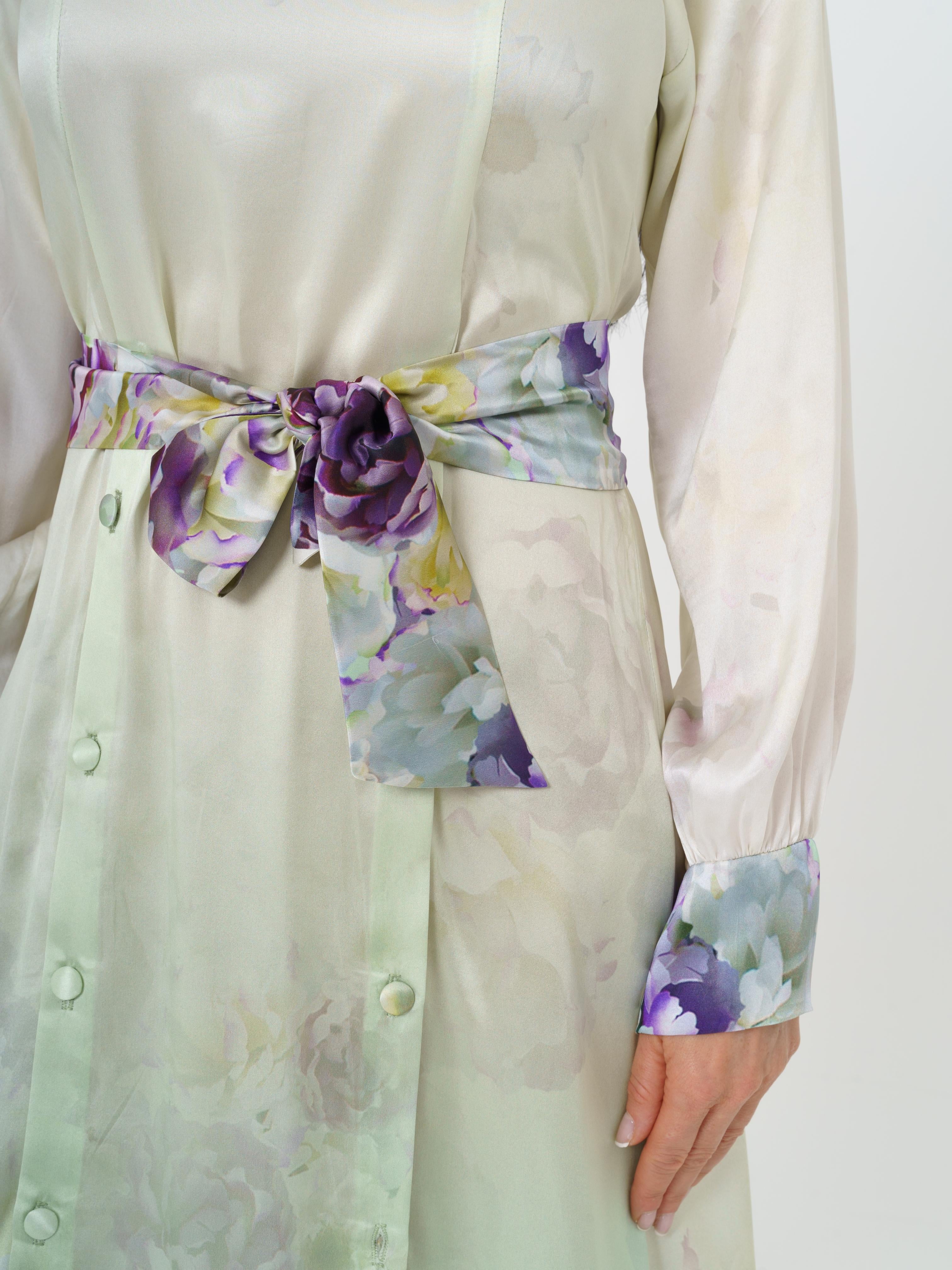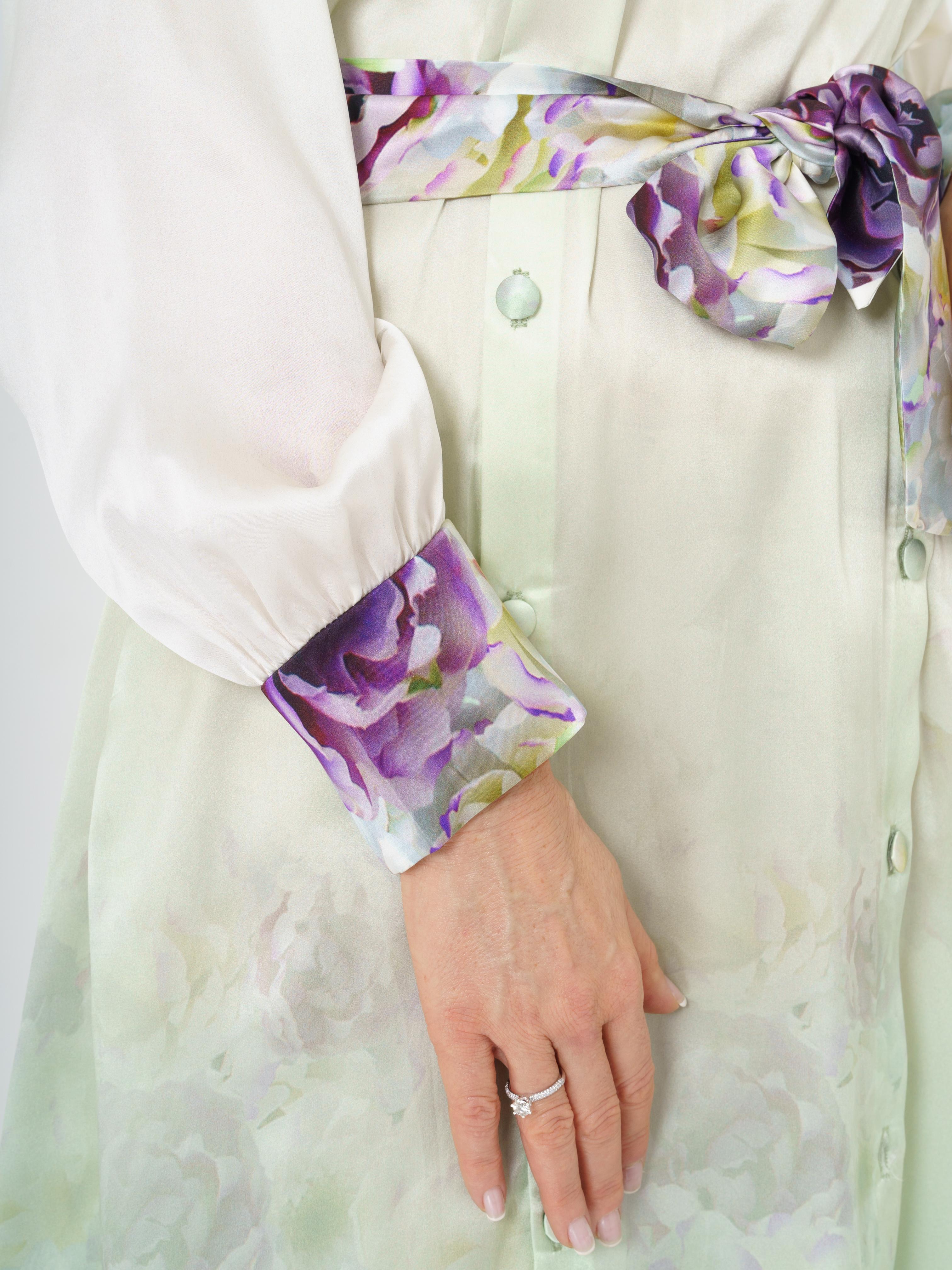 Elegant long dress made of high quality silk. The fabric design features delicate flowers in green and purple tones. The dress opens at the front with buttons. The back of the dress also opens with buttons.