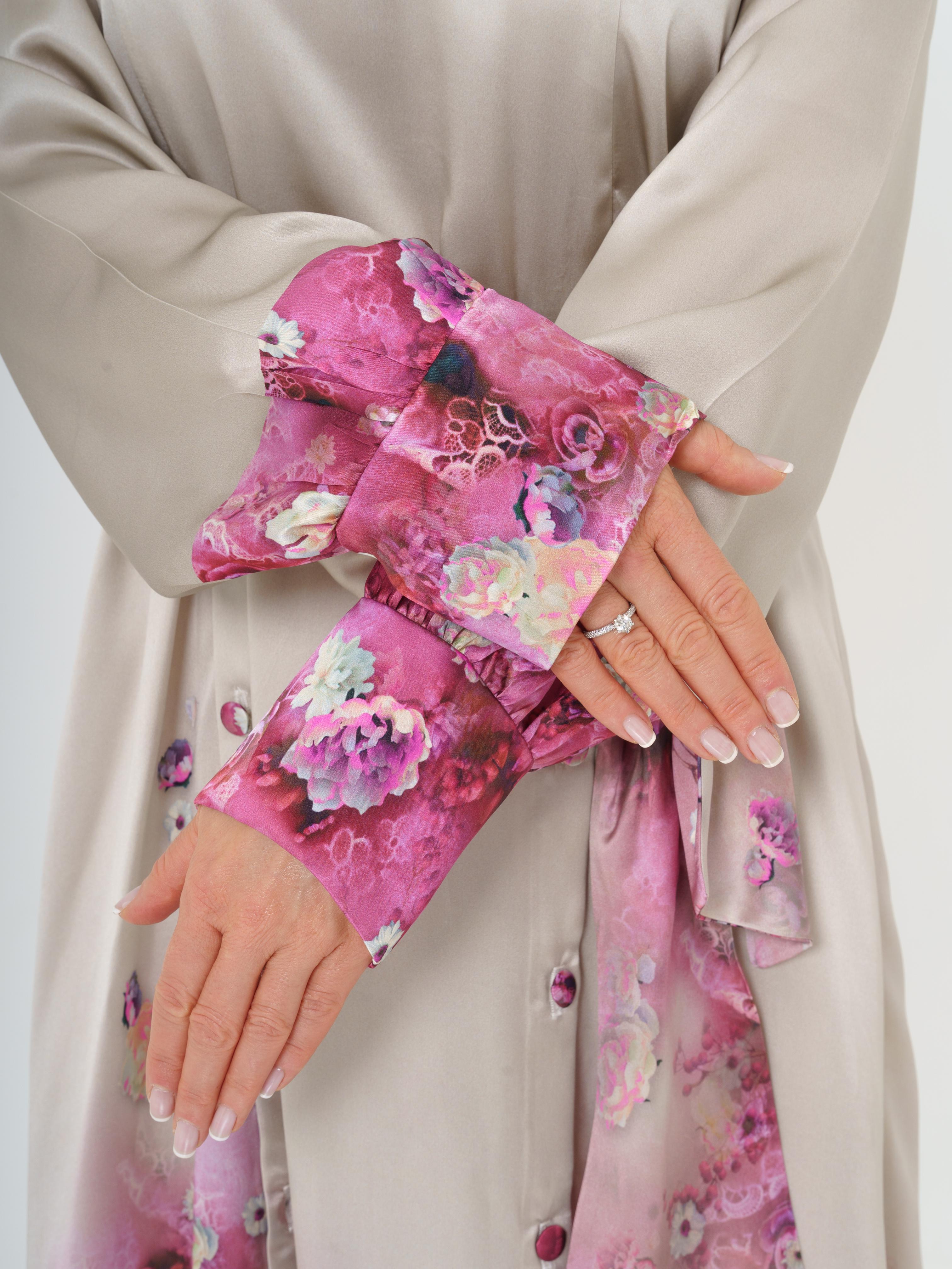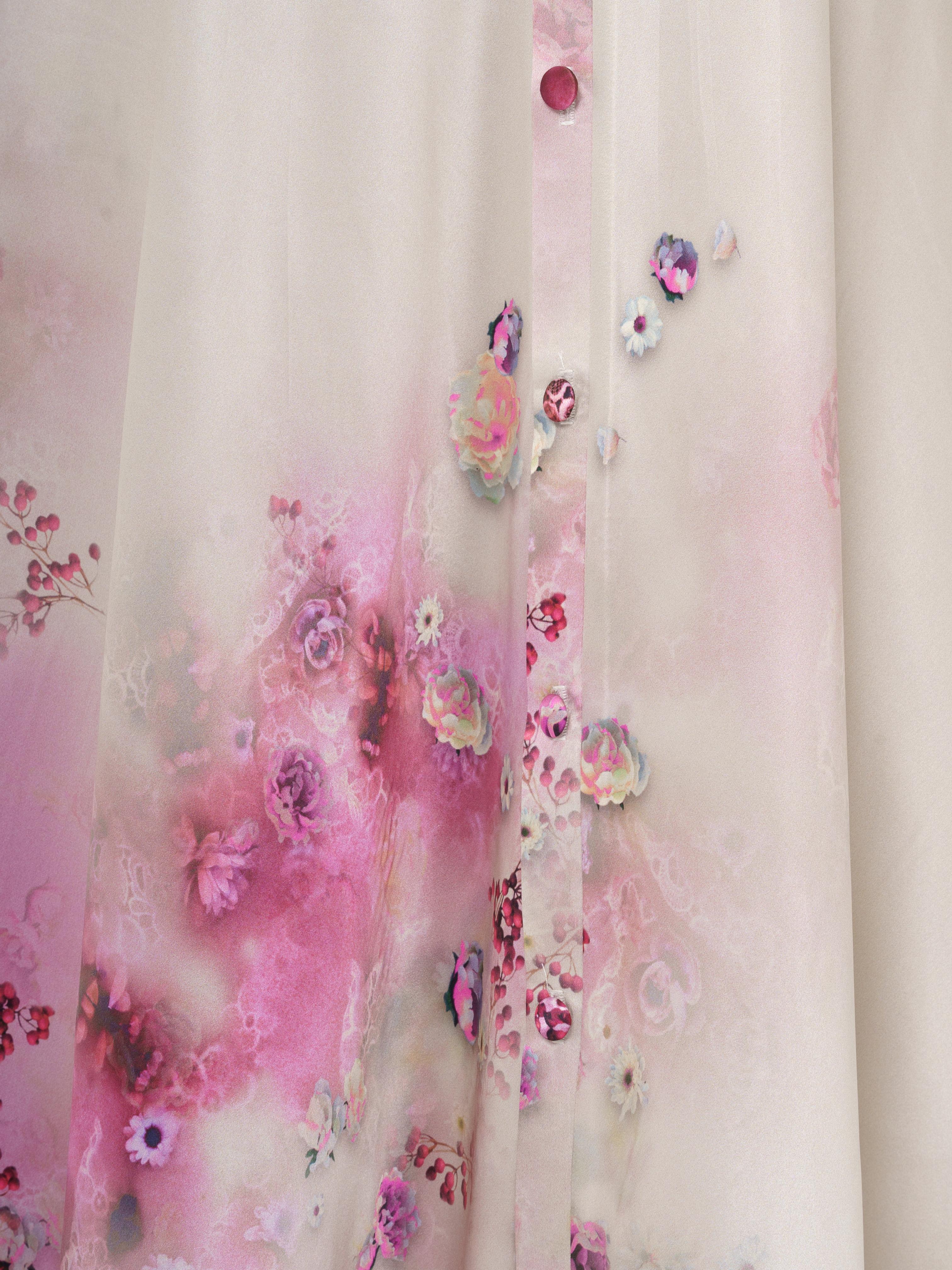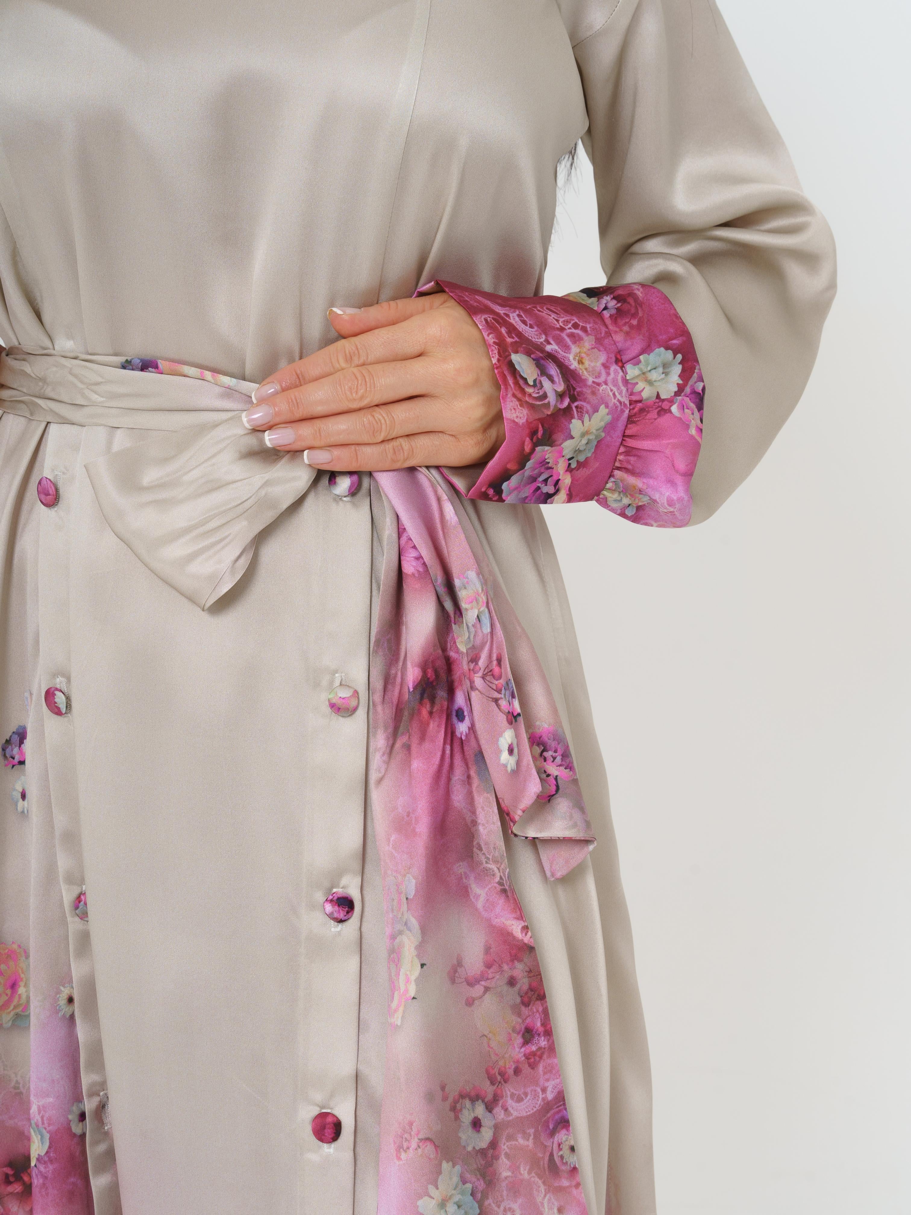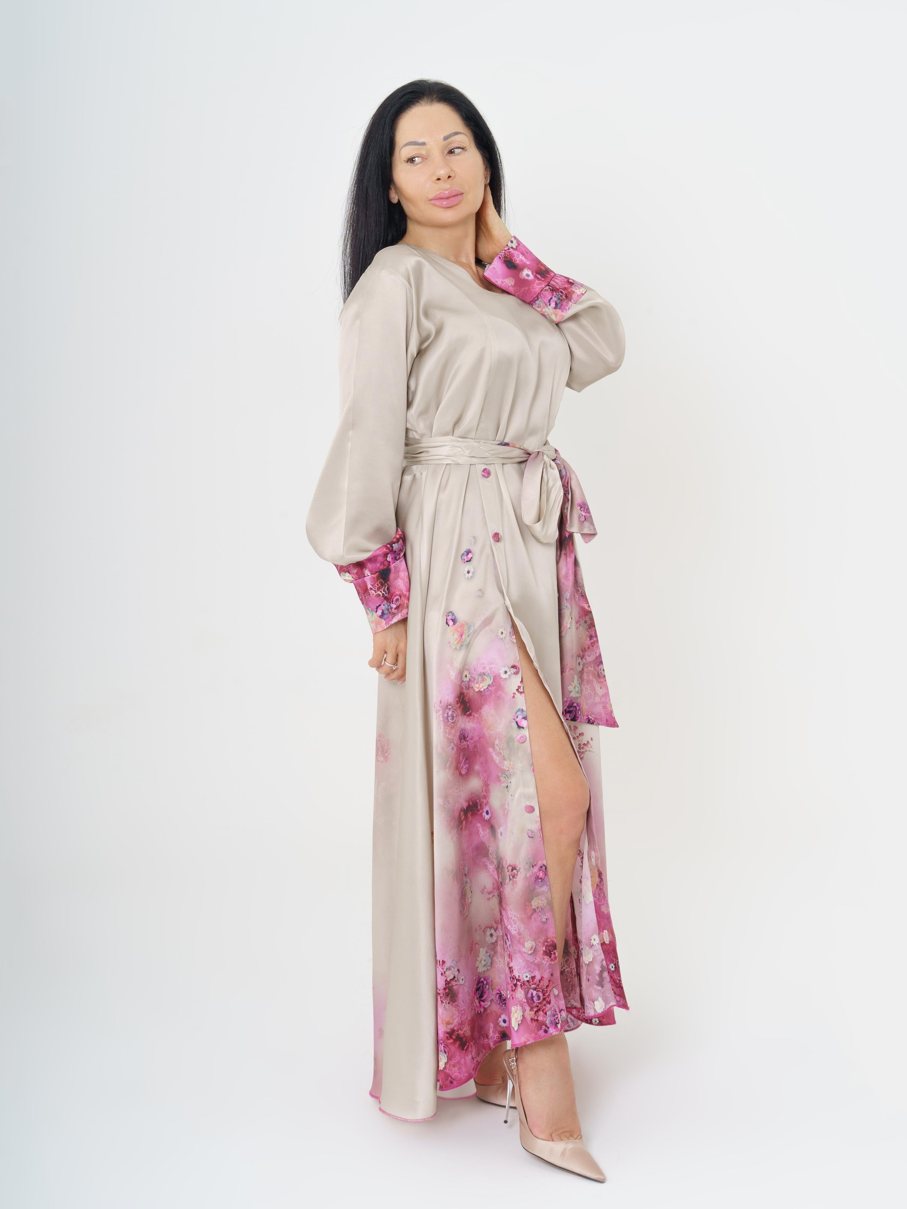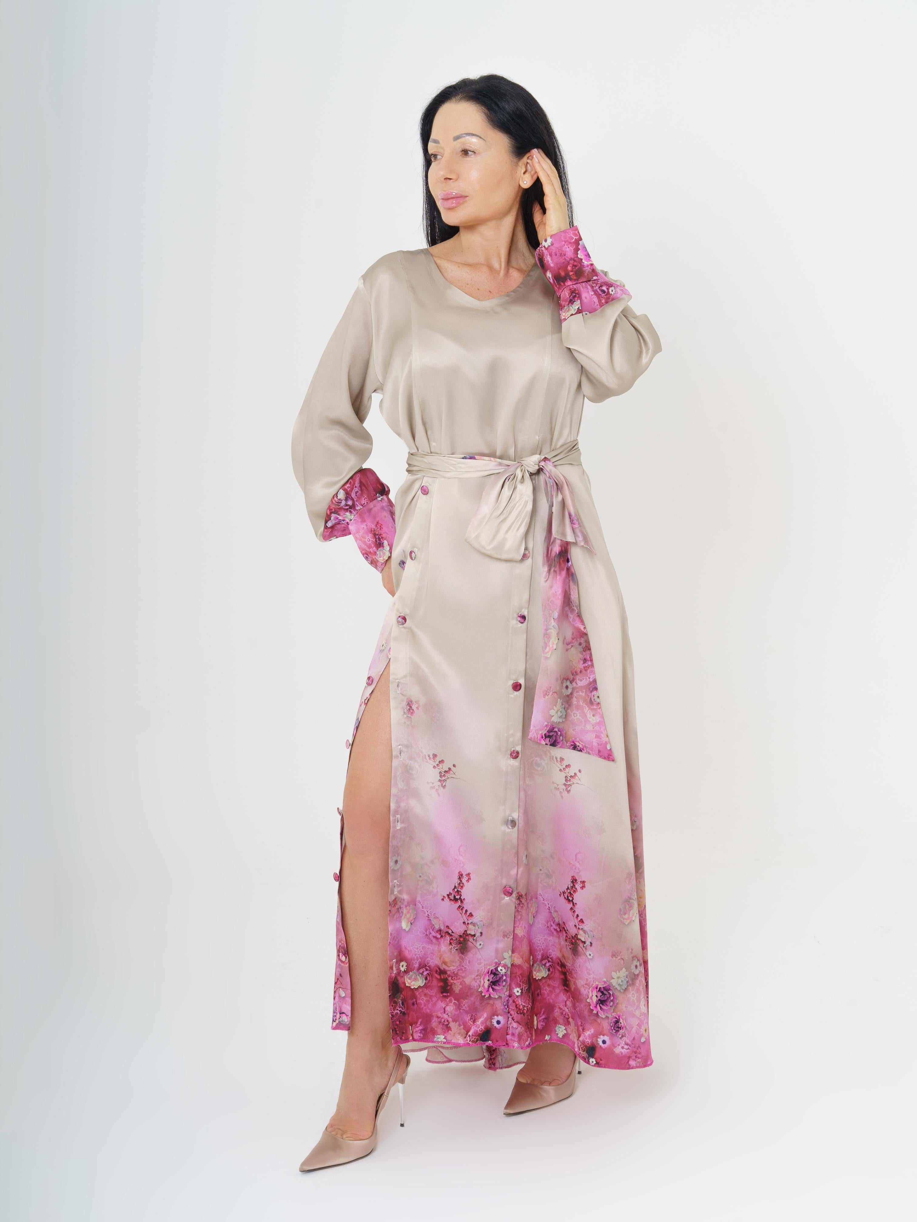 Elegant long dress made of high quality silk. The fabric design features delicate flowers in the pink tones. The dress opens at the front with buttons. The back of the dress also opens with buttons.