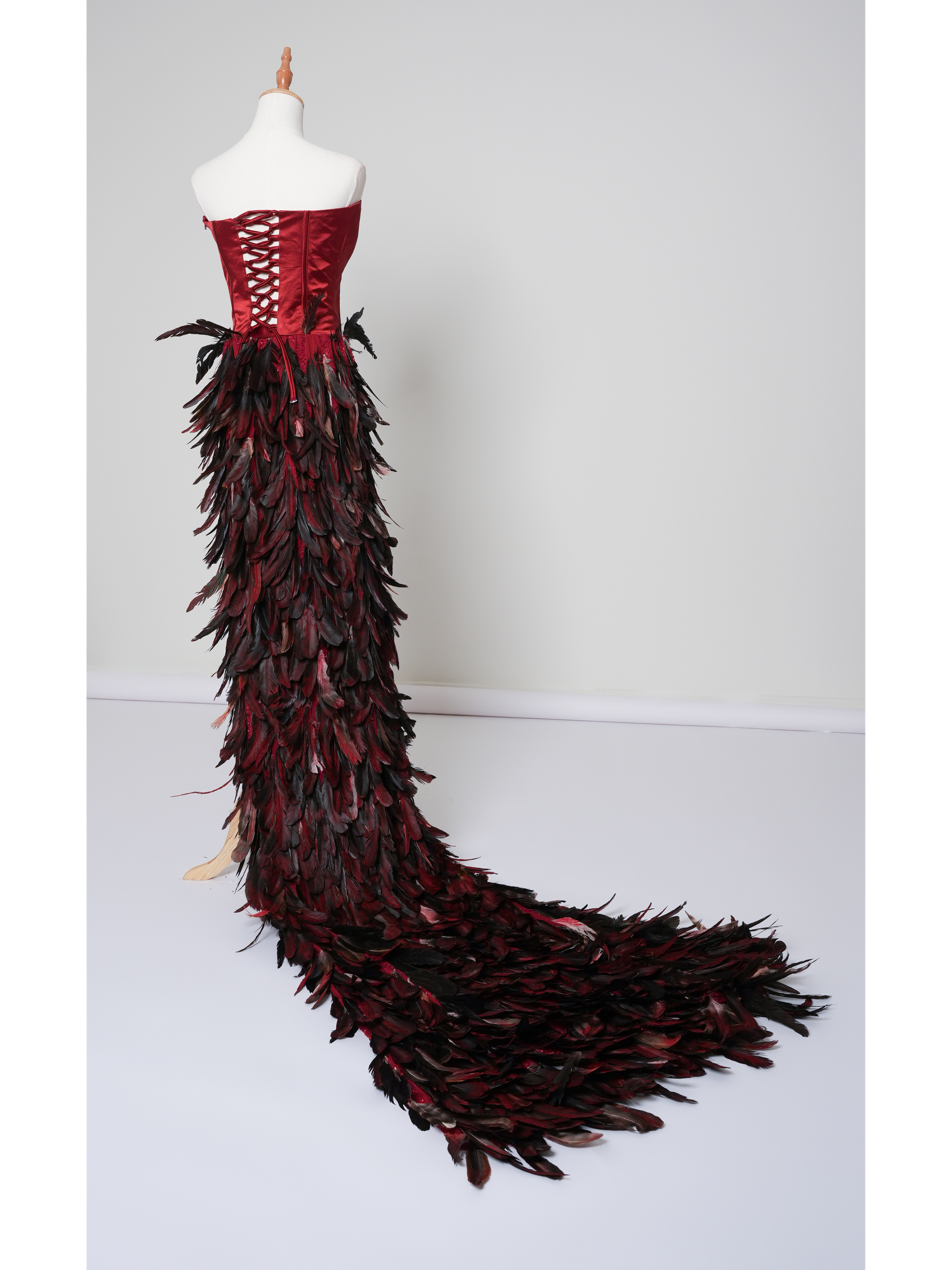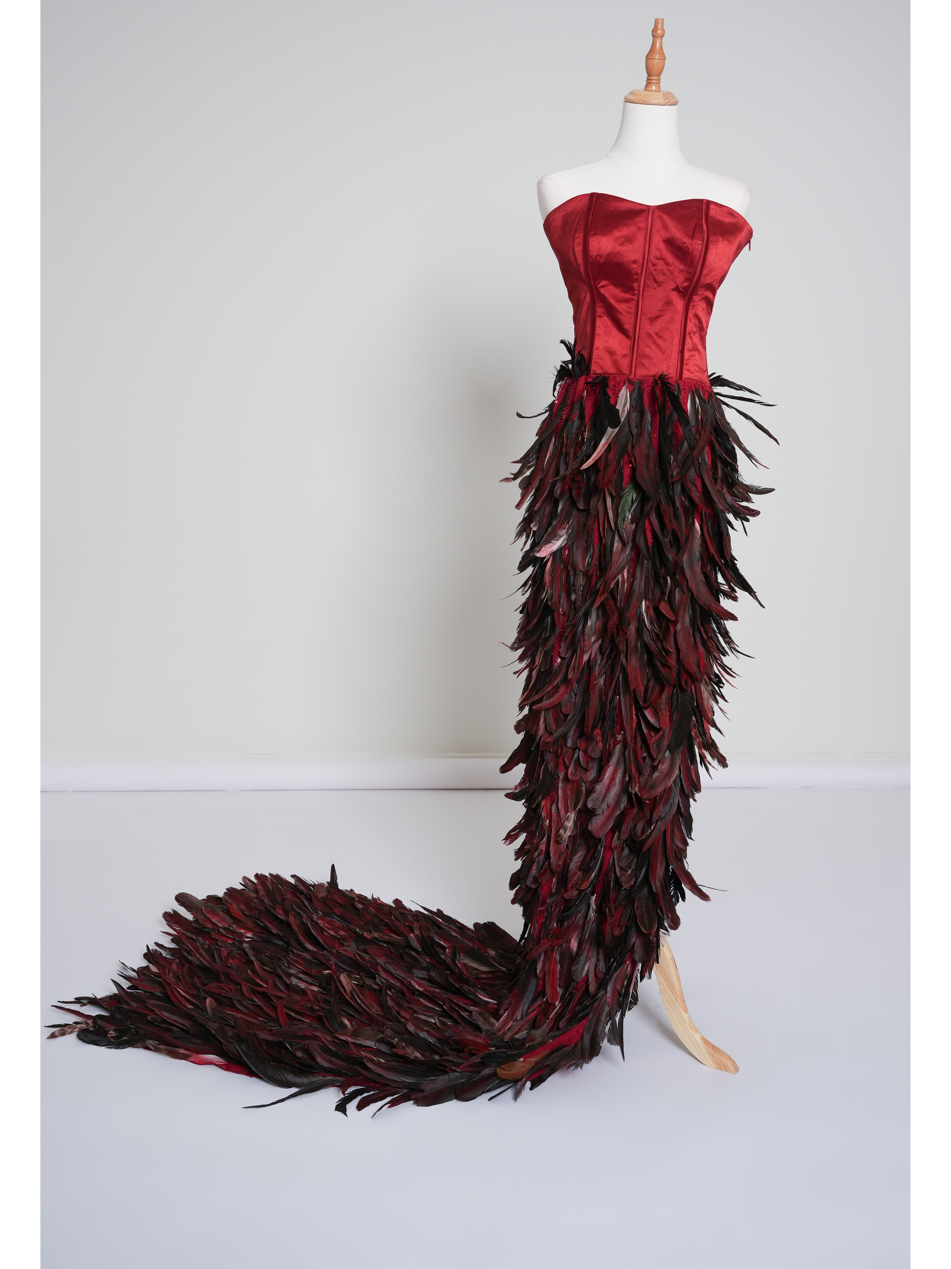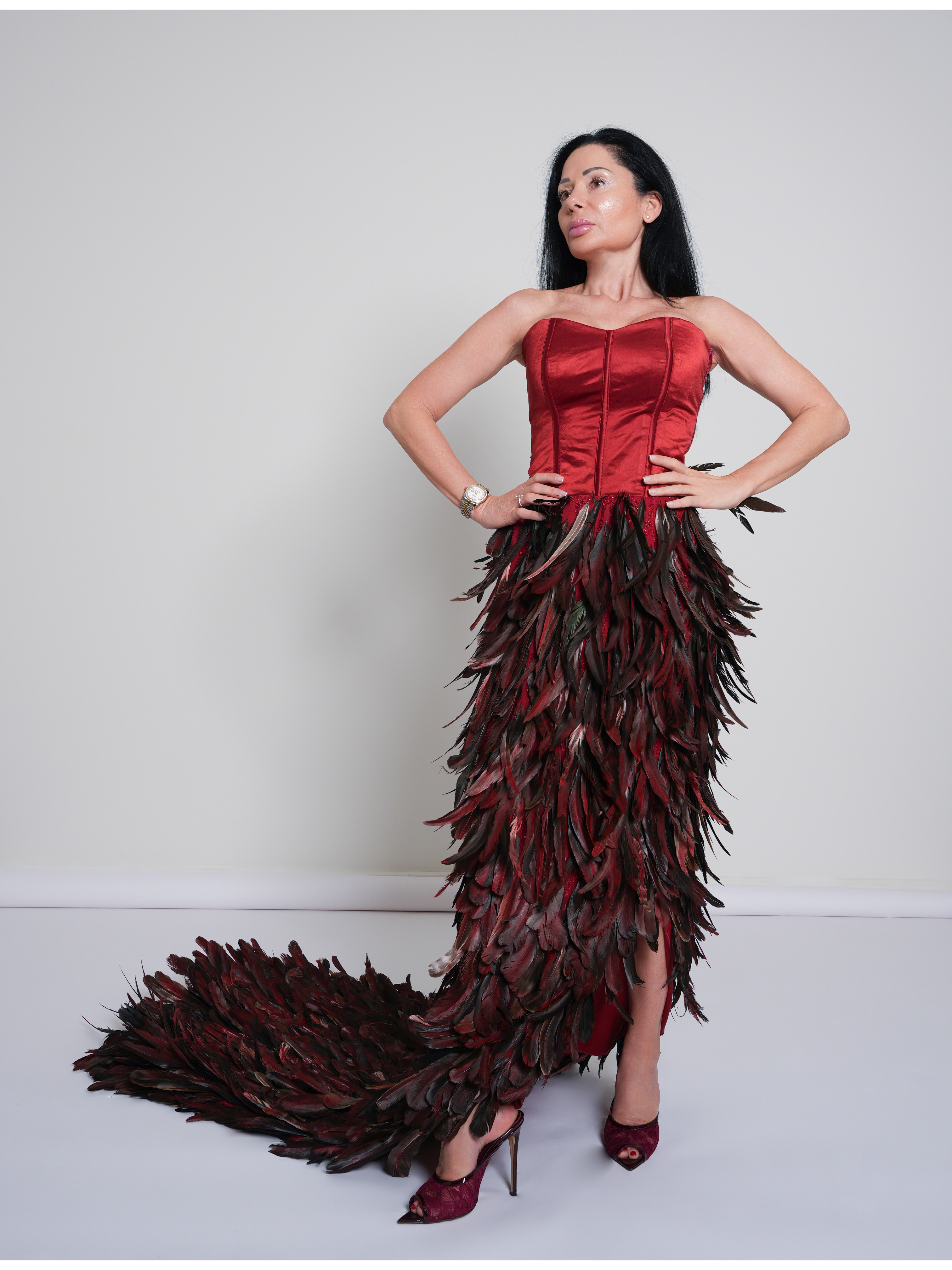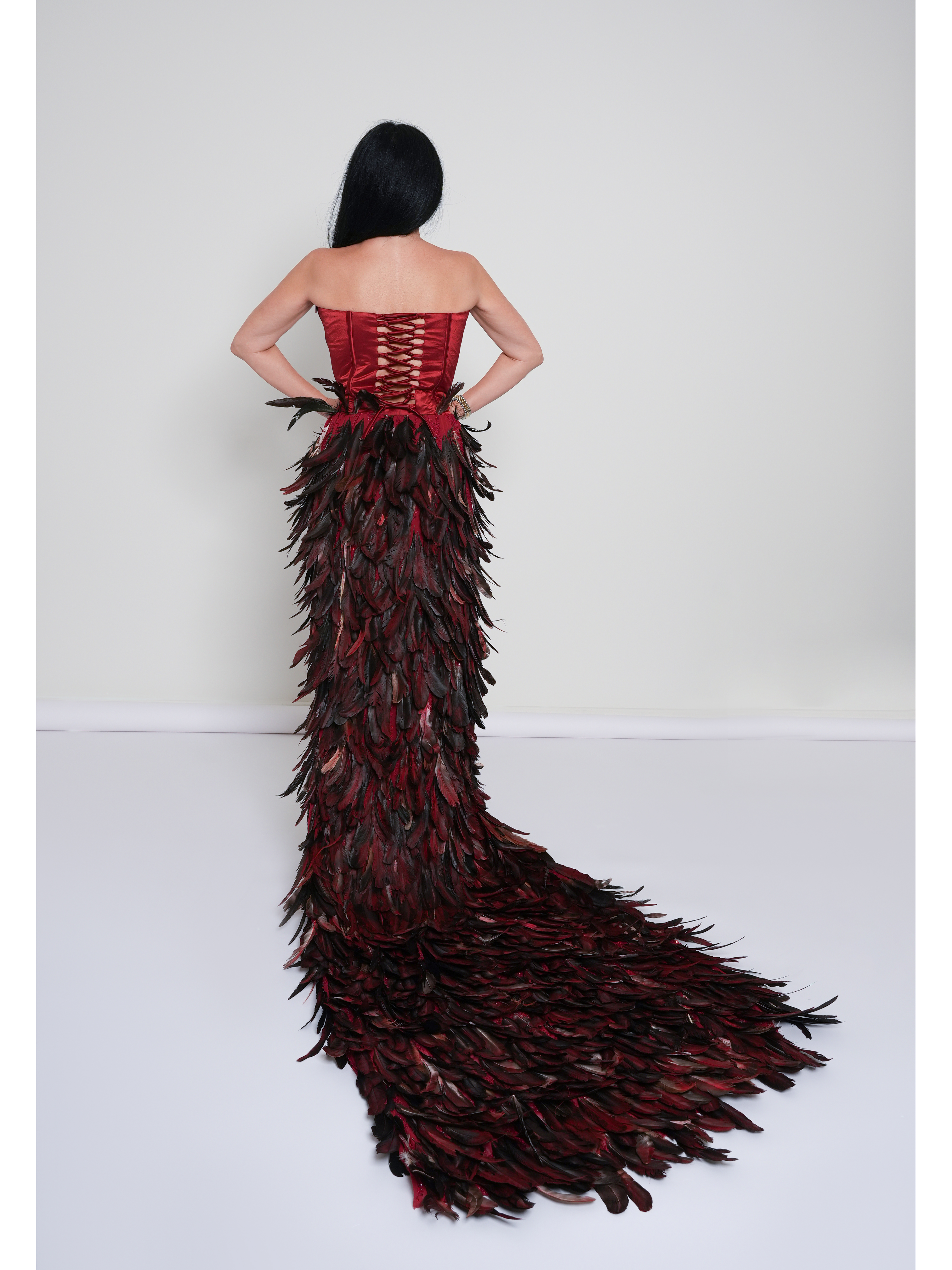Long elegant women's dress in red. The upper part of the dress is a bustier that is adjustable with ties at the back. The lower part is made of high quality fabric with hand-applied silk feathers. Mariya is tall 1,67 m and represents size XS. Made with love in Qatar.
